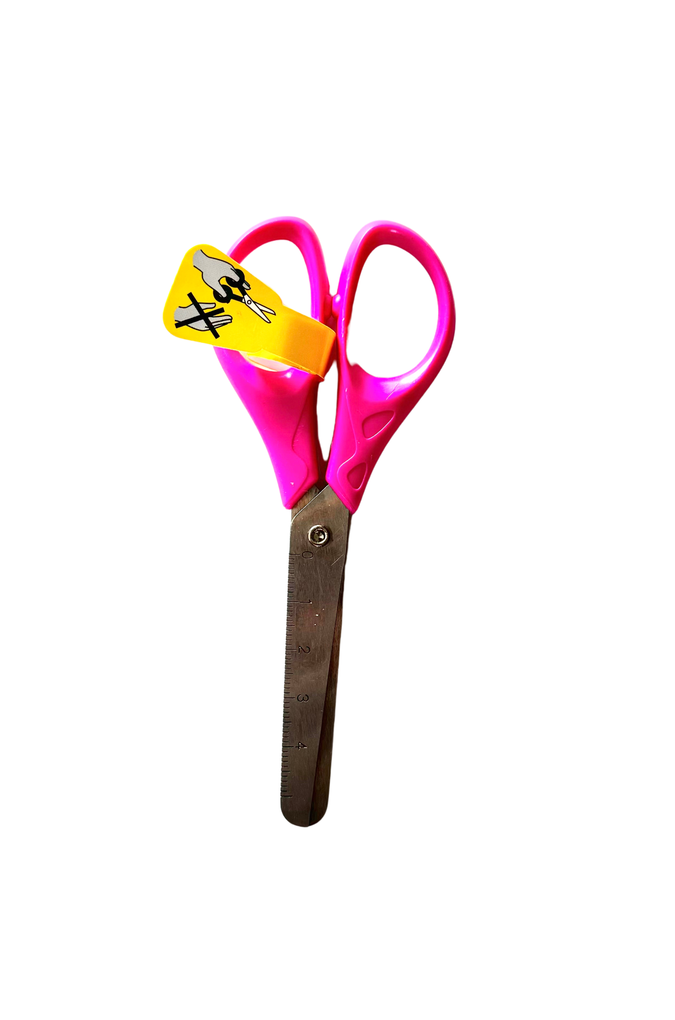 Roze of blauwe schaar met roestvrijstalen bladen, speciaal ontworpen voor linkshandige kinderen. De afgeronde punten maken het veilig voor jonge kinderen.